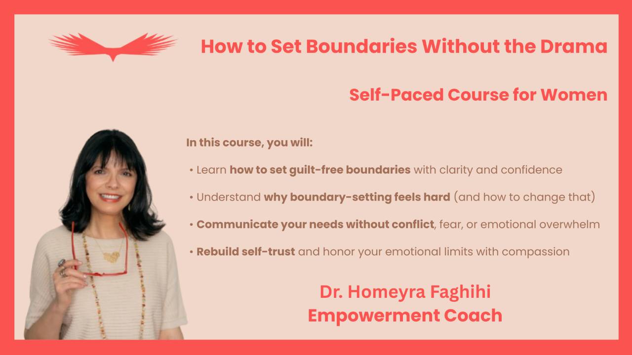 Dr. Homeyra Faghihi, PsyD, LCSW, is an Empowerment Coach, Teacher, and Psychotherapist with over 26 years of experience. She has served as a Lecturer, Clinical Supervisor, Social Worker, and Field Instructor, guiding others toward self-awareness and transformation.